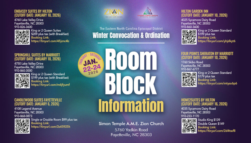 All services and activities will be held at Simon Temple A.M.E. Zion Church, located at 5760 Yadkin Road in Fayetteville. This room block information is provided to ensure a smooth and convenient lodging experience for all who plan to participate in this important gathering of the Eastern North Carolina Episcopal District. #AMEZion#ENCAMEZion